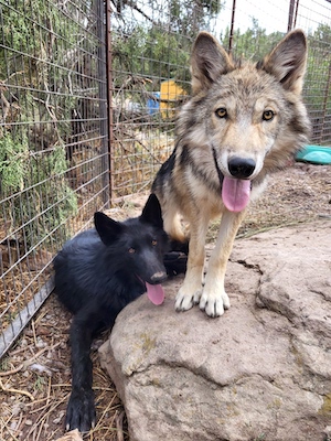 As wolf puppies without a real canine parental figure, they are less sure of themselves with new people and situations. But we are hoping we will be able to make them into ambassador animals. As long as they have one of their trusted people with them, they are happy to greet visitors on tours. Dembe is the braver of the two when meeting new people, but both can be skittish. They favor women over men for the most part, but do come around to men with patience and lots of treats.